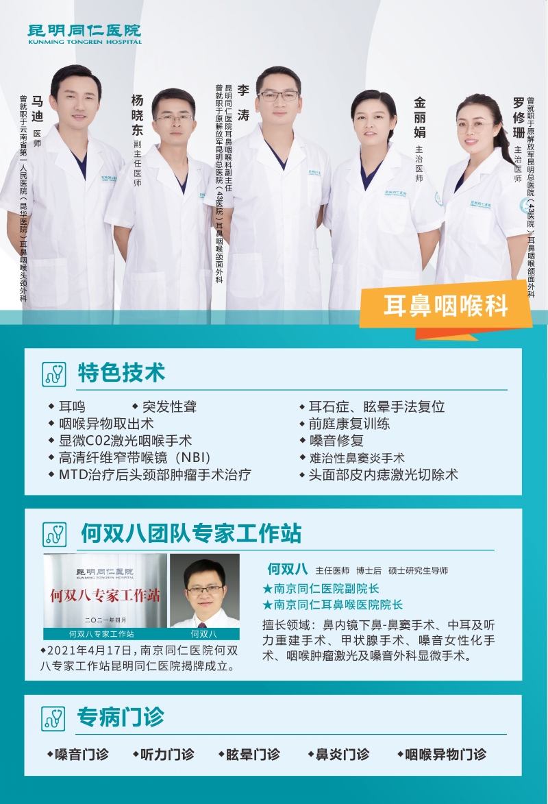 眩晕、耳鸣、突发性聋、咽喉异物取出术、显微C02激光咽喉手术、显微缝合技术、高清纤维窄带喉镜(NBI)、MTD治疗后头颈部肿瘤手术治疗、耳石症、眩晕手法复位、前庭康复训练、嗓音修复、难治性鼻窦手术、头面部皮内痣激光切除术。