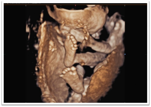 三维/四维超声作为临床超声诊断新技术,经过不断改进更新,使图像清晰、立体、逼真,提供的三维空间信息可弥补二维超声的不足,使超声诊断准确率明显提高。而实时三维超声能够清晰显示胎儿在宫内的各种姿势和动作, 如胎儿的手势、吞咽、打哈欠、 肢体运动等,图像质量不受胎儿运动的影响。