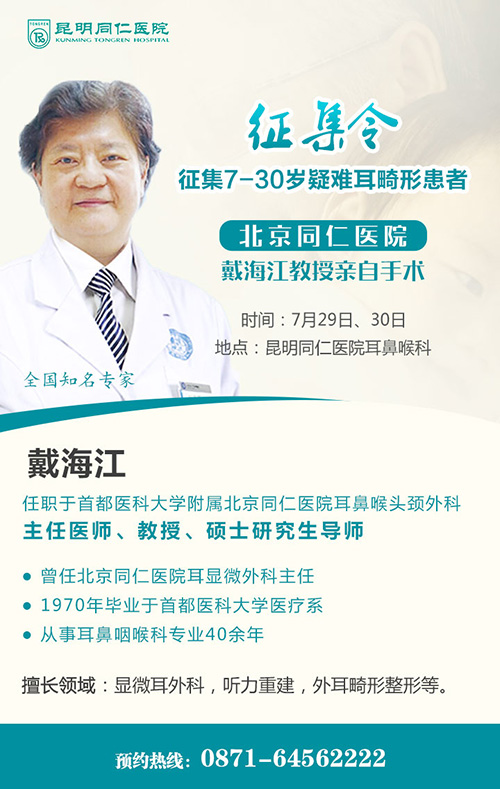 7月29、30日,全国知名专家——北京少妇色情 耳鼻喉科戴海江教授莅临少妇色情 开展疑难耳畸形手术,7-30岁耳畸形患者可预约戴海江亲自手术,解决您的“耳部难题”。