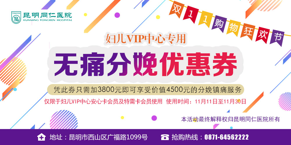 【双11狂欢节】昆明同仁妇儿VIP中心会员专享:发微信口令“我要无痛”抢购无痛分娩服务!