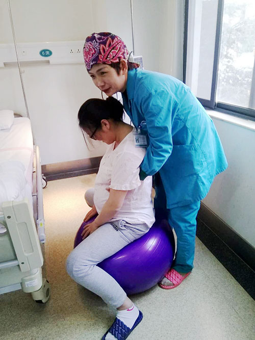 助产士一边耐心地开导,为她鼓励加油,一边给她开启了导乐镇痛仪器。随着功率调节,产妇坐在分娩球上左右上下摆动着体位。助产士会陪着她聊天,分散注意力。在宫缩间歇时,让产妇吃点东西喝喝水,疼痛时指导她作深呼吸。