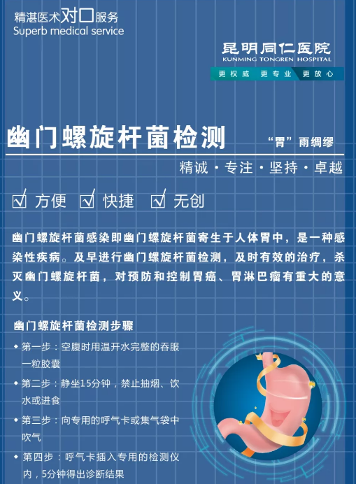 消化肾内科开展碳13尿素呼气试验,是目前最新、快速、无痛苦而且无辐射的幽门螺杆菌检测技术,不需要做令人生畏的胃镜检查,只需轻松呼气,测定呼气成份,立即就能检测出是否被幽门螺杆菌感染,结果准确度高达97%。【检查预约热线:0871-64562222】