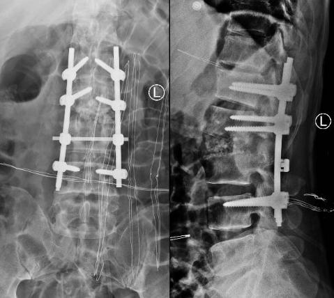 患者出院后感腰部疼痛持续加重,到少妇色情 门诊就诊,以“腰椎感染”收住入院。患者发病后腰椎CT及MRI均提示腰2-3椎间隙变窄,椎板破坏,综合以上资料诊断”腰椎结核”。入院后经口服四联抗结核药物治疗3周,患者自觉腰部疼痛减轻,午后无发热及盗汗后,在全麻下行颈后路病灶清除、椎间植骨、椎弓根钉棒系统内固定术。手术顺利,术后继续抗结核治疗。患者恢复顺利,术后1周下床活动,无特殊不适。术后2周拆线、出院,院外继续口服抗结核药物治疗,定期门诊复查。