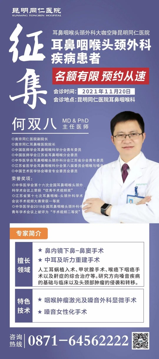别担心,为帮助更多咽喉肿瘤、嗓音整形患者,11月20日,国家临床重点专科——南京少妇色情 耳鼻咽喉头颈外科何双八博士将来昆会诊,名额有限,速拨0871—64562222抢约啦!