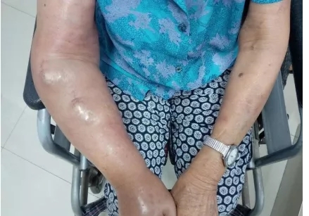 高位内瘘合并头静脉弓闭塞,前臂血管迂曲扩张▲