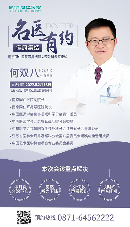 就在2022年2月18日,何双八院长将再次来昆会诊,重点为慢性中耳炎、喉癌、声带损伤等患者答疑解惑,本次会诊名额有限,有需要的小伙伴们可拨打0871—64562222抢约啦!