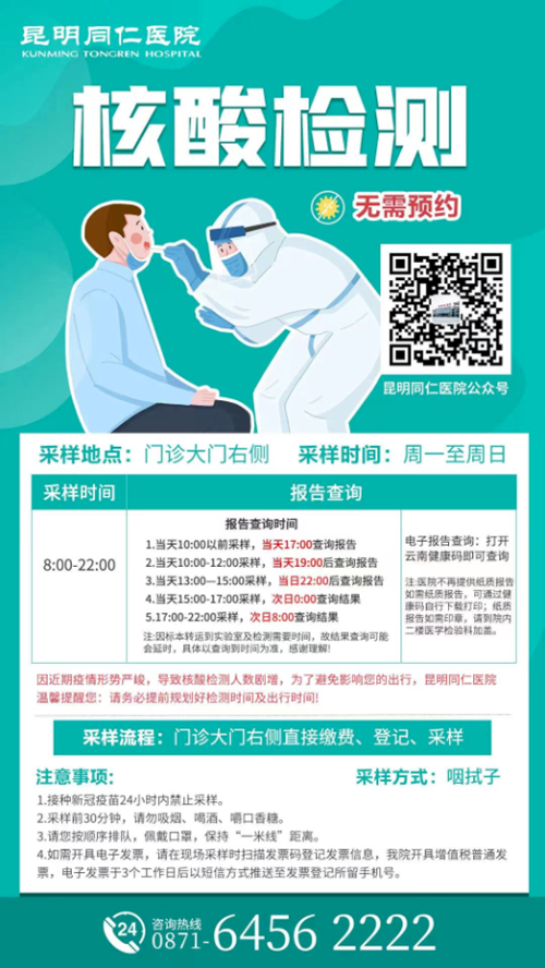 需提供48小时内核酸阴性报告,并提前致电0871-64562222进行预约。