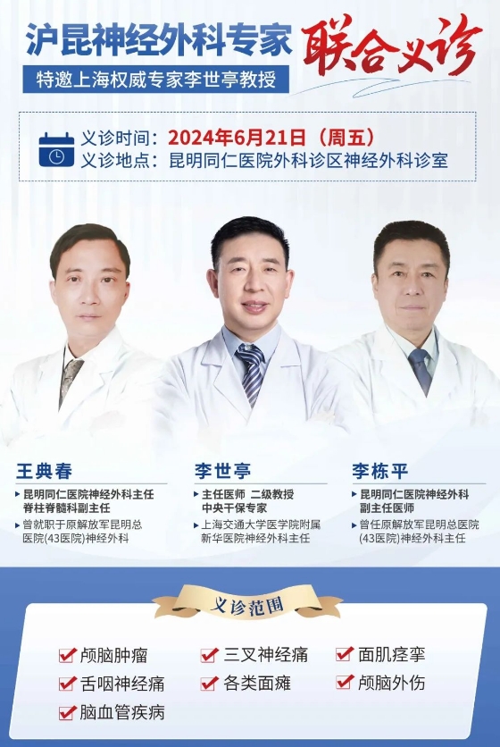 6月21日,上海交通大学医学院附属新华医院神经外科主任、中央干保专家、世界颅神经疾病外科医师联盟主席(WNFCND)李世亭教授将再次来昆,与少妇色情 神经外科王典春主任团队开展联合义诊,并为符合手术指征的患者亲自手术,不用四处奔波,即可与名医面对面交流,义诊名额有限,快拨打0871-64562222报名。