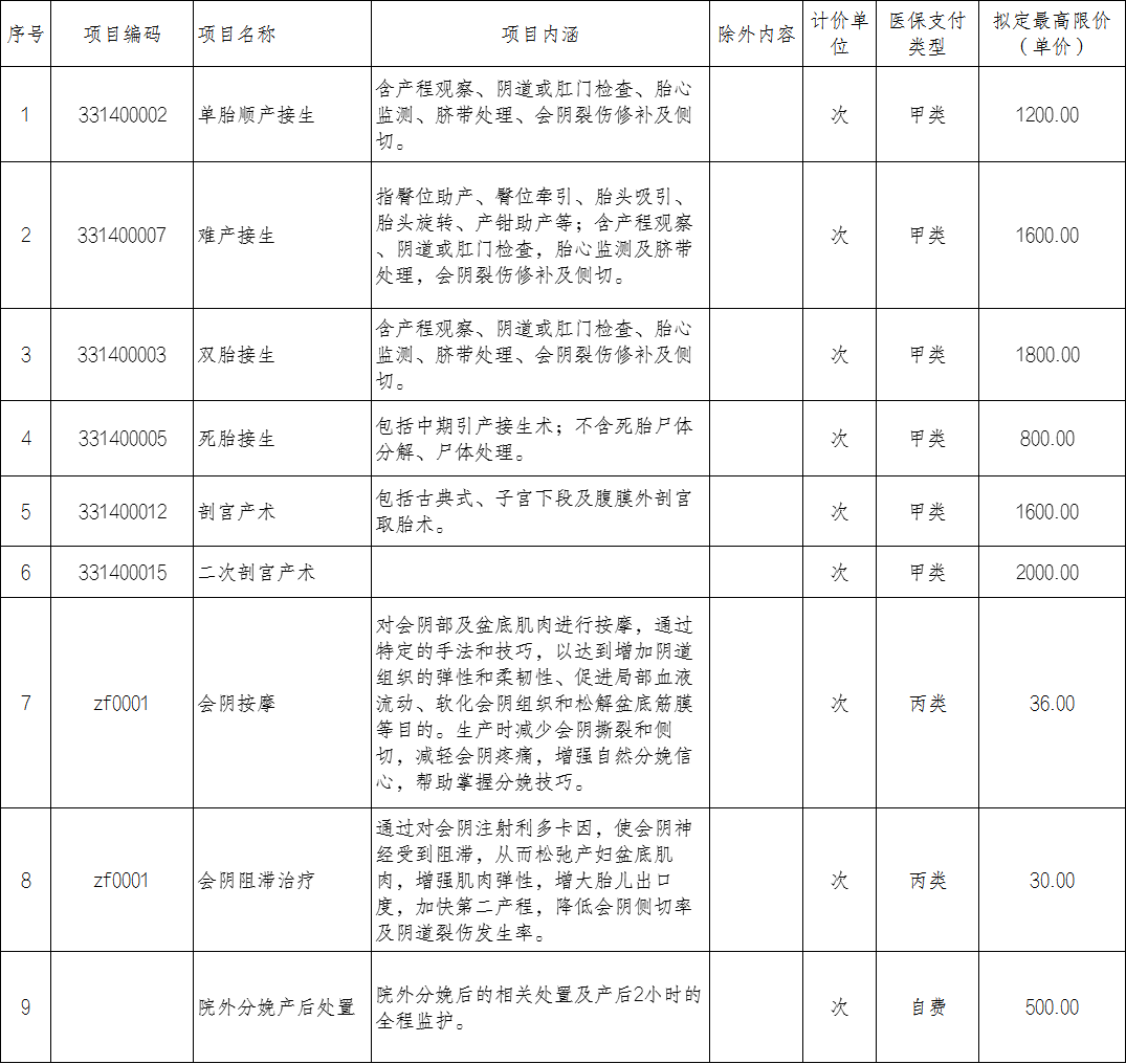 为促进产科业务的拓展,满足产妇多元化医疗服务需求,我院本着公平、合法和诚实信用的原则,根据业务开展的需求对部分医疗服务项目价格进行自主定价,并在执行前一周进行公示,现将项目名称及价格公示如下: