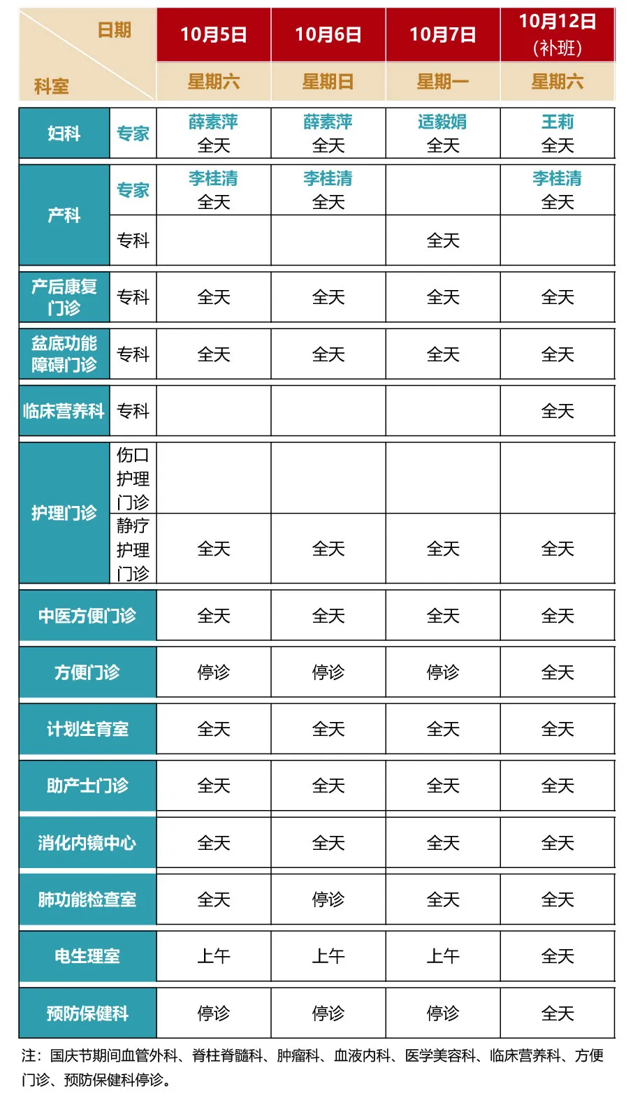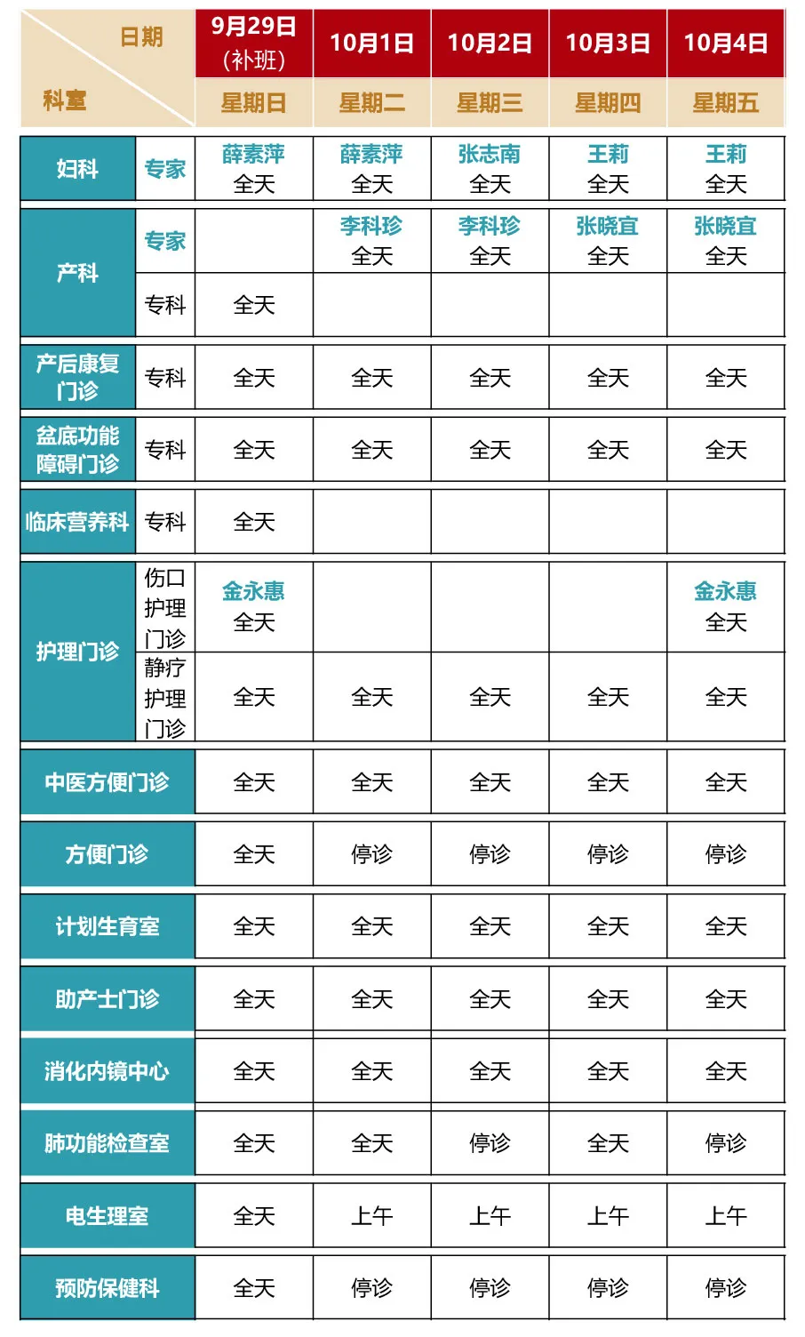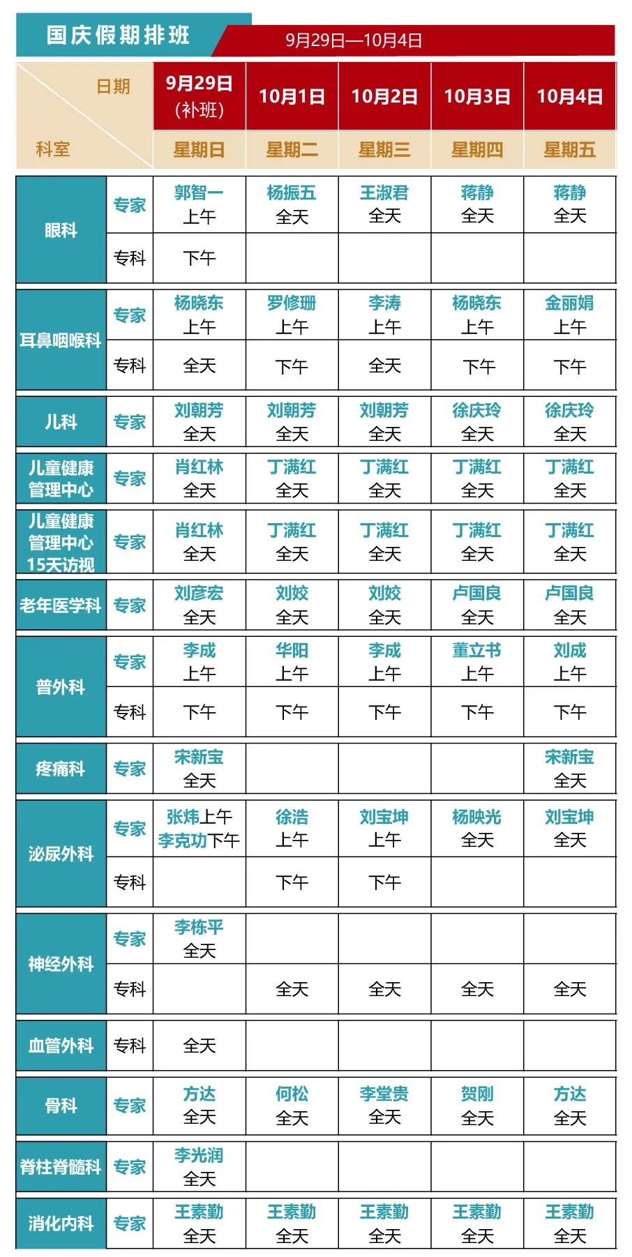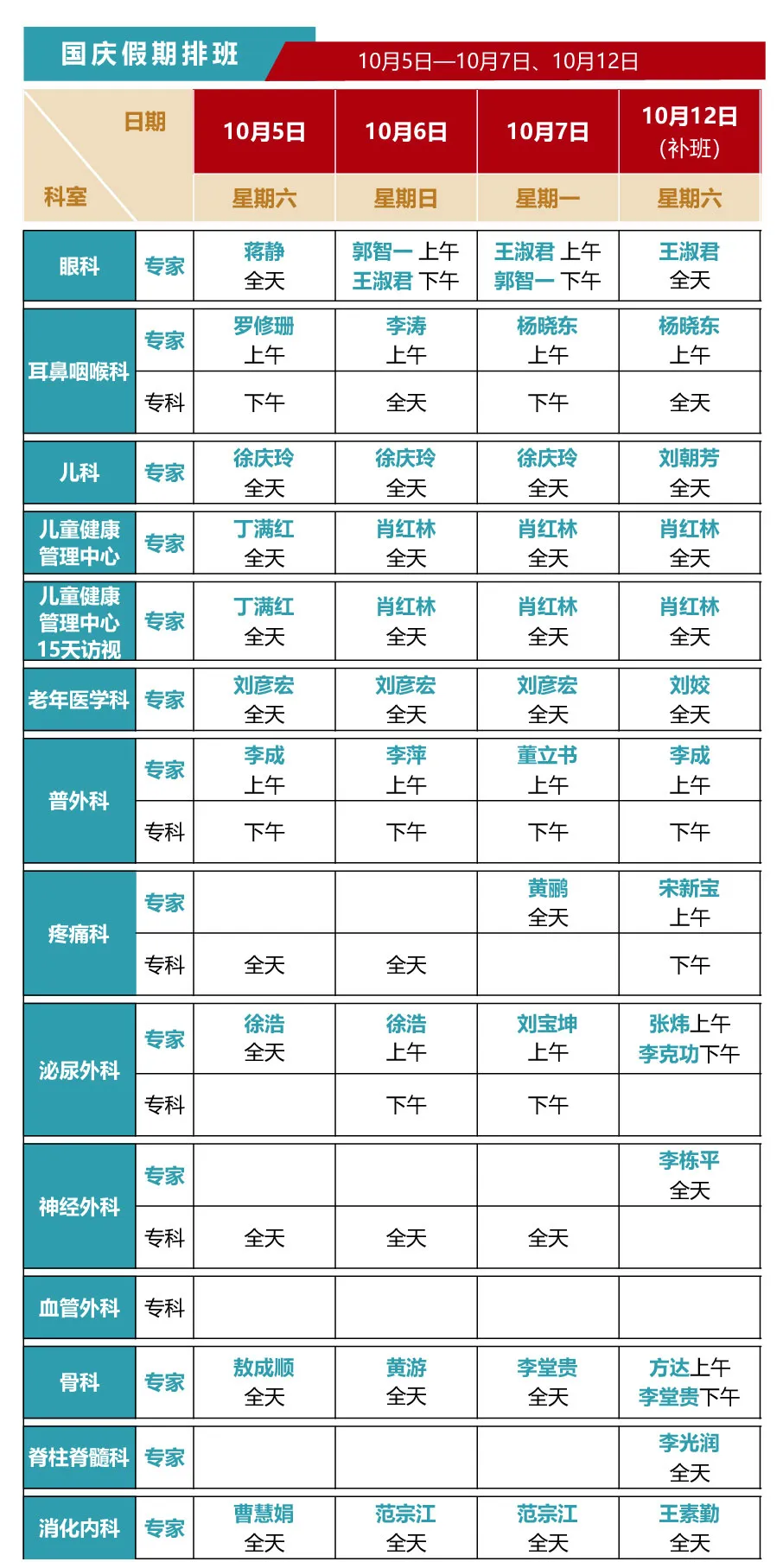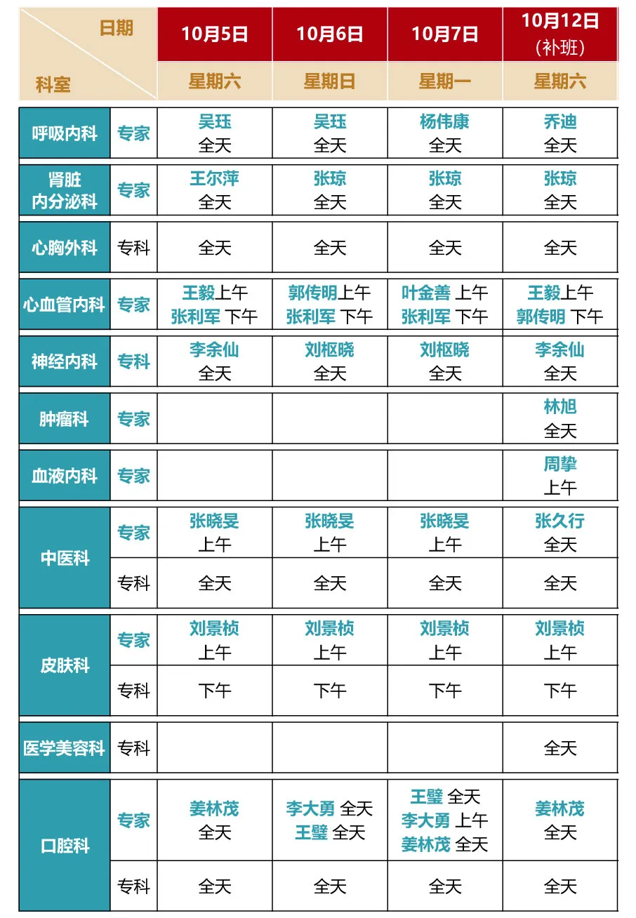 专家坐诊时间如下