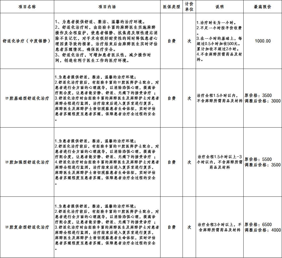 为促进口腔舒适化治疗技术在临床的推广应用,提高患者口腔就医体验感,让患者在感觉舒适、放松的情况下,完成口腔的相关诊疗过程,因此我院本着公平、合法和诚实信用的原则,根据业务开展的需求调整舒适化治疗相关医疗服务项目价格,并在执行前一周进行公示,现将项目名称及价格公示如下: